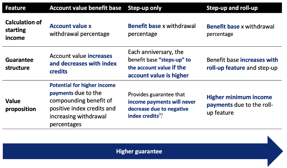 RILA GLWBs fall into three major categories: account value benefit base, step-up only, and step-up and roll-up. All contracts begin in an accumulation phase wherein the customer’s lifetime income benefit has the potential to increase. When the customer elects to utilize the rider, the income phase of the contract begins, and the insurer starts making payments.