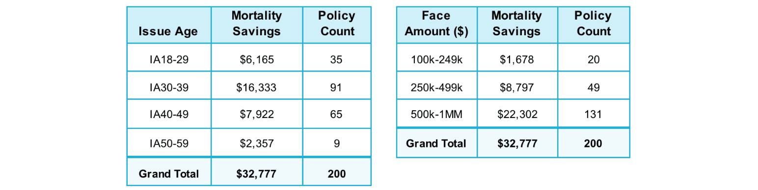 Table 1 summarizes the mortality savings and distribution results by issue age and face amount.