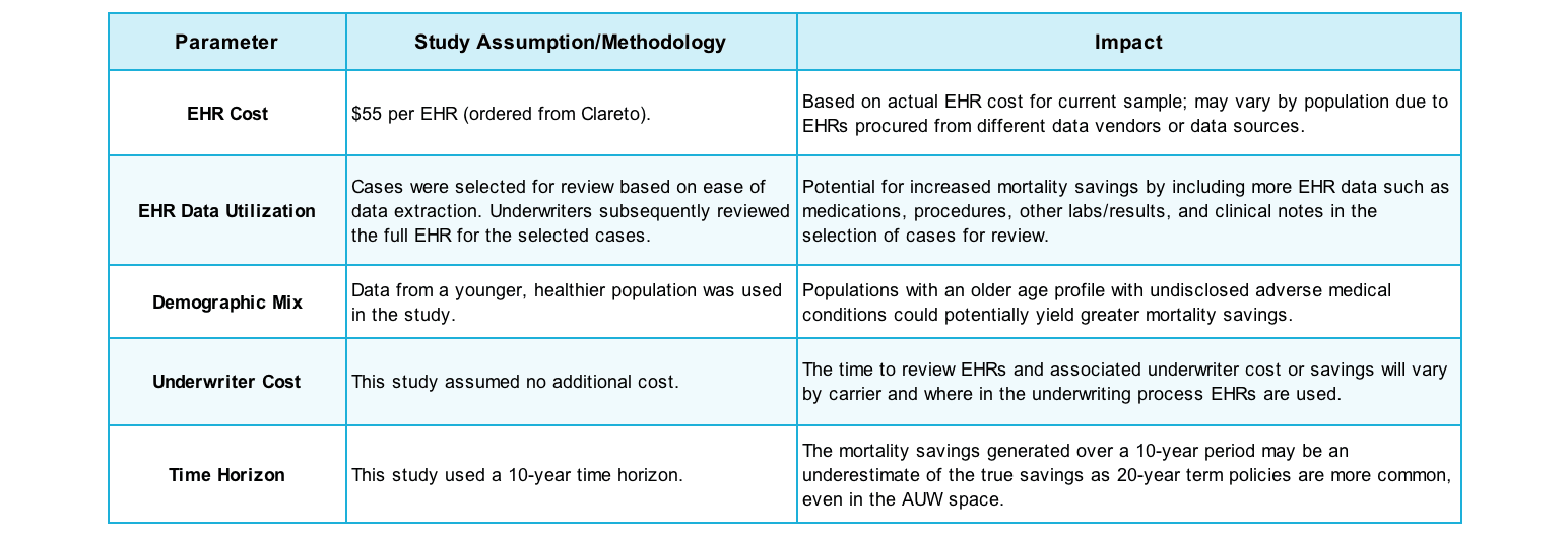 Carriers should consider comparing the mortality savings from using EHRs against their unique program features and cost structures to assess the value of using EHRs on their block of business.
