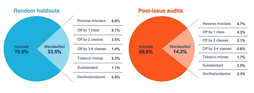 In aggregate, across both audit methods, we see that 81% of randomly audited cases are assessed at the same risk class as the AUW decision. The remaining audited cases span a wide range of misclassification severities from preferred class differences to decline assessments. We’ve observed that the prevalence of these misclassification severities varies noticeably by audit method, as shown in Figure 1. Random holdouts are more likely to capture minor differences in risk class assessment, including “reverse misclassifications” (where the AUW assigned class is more conservative than the FUW class) and single class differences, while post-issue audit methods are more likely to capture severe misclassifications such as rated, postpone, and decline decisions.
