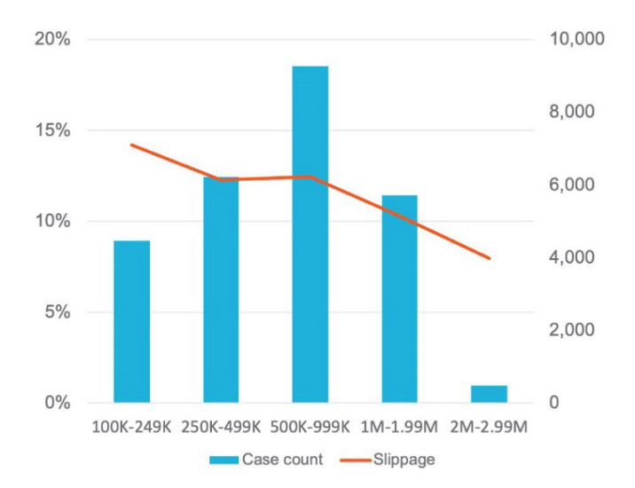 - Increasing face amounts have a downward mortality slippage trend, as shown in Figure 3. This may be a result of more stringent AUW data requirements and more human underwriter review at higher face amounts, or could be driven by different target markets/demographics represented across the spectrum of face bands.