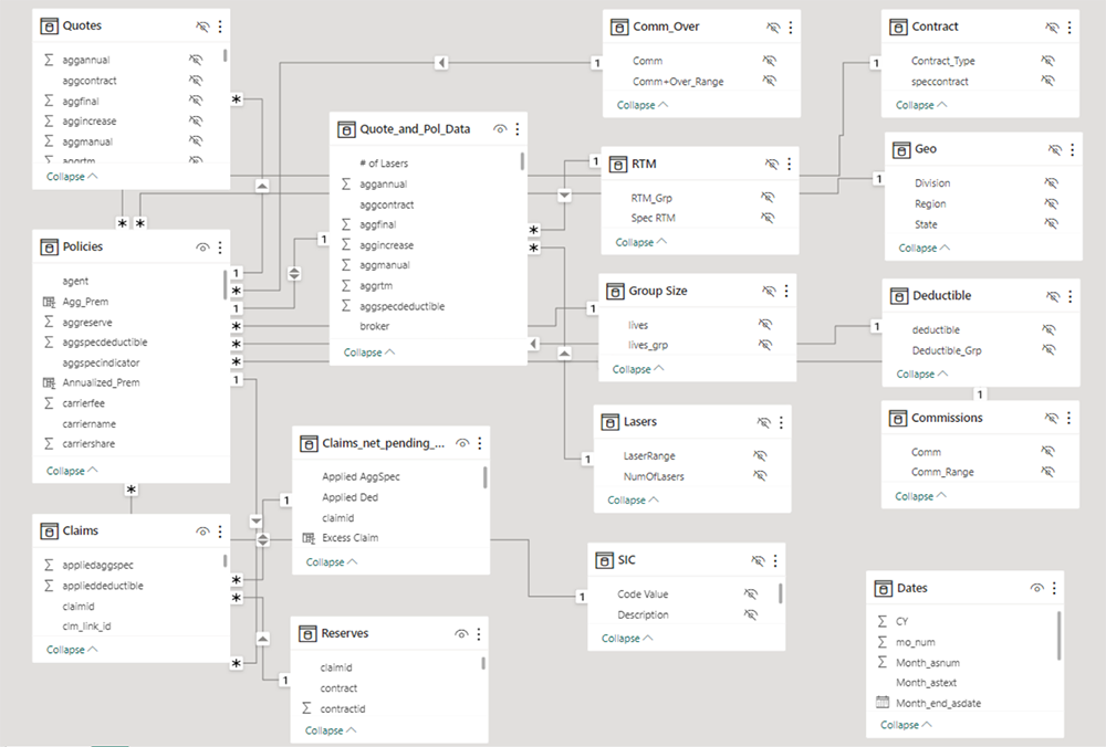 - The BI Solution: An interactive, user-friendly tool that would allow external parties to derive answers without relying solely on the actuary. This "self-service" model allowed underwriters to quickly access insights and delve deeper into data, seeking competitive edges or identifying risks, and provided a single, easy-to-access source of information for all historical data and characteristics of a selected group.