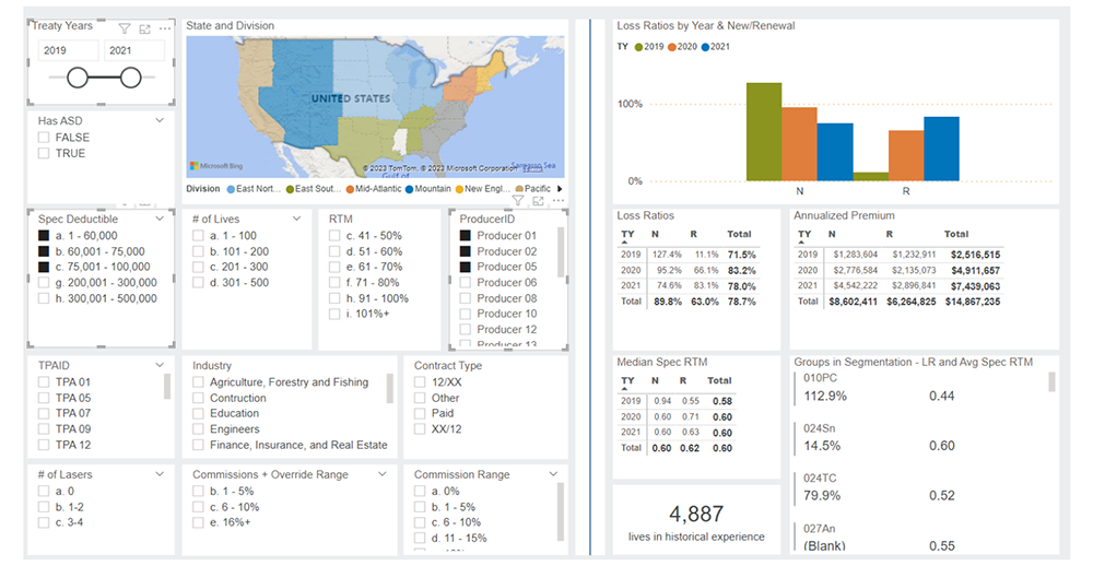 Clearly, different stakeholders will have specific KPIs they want to focus on, so you will need to align your dashboard or tool to the appropriate audience. Underwriters assess risks tied to policies, ensuring appropriate pricing and coverage. Sales representatives focus on growth and production, pinpointing areas ripe for opportunity. Meanwhile, management relies on KPIs to oversee business health and steer strategic choices. The following sections delve into three different company case studies each with unique needs: a segmentation tool, a group-level historical performance summary, and a growth and production dashboard. While these are all examples from employer stop loss business, similar challenges and solutions could apply to many other lines of business.