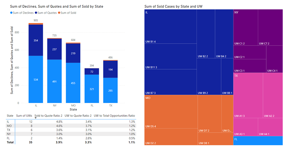 - The BI Solution: Build a means to monitor sales and submission volume by different segmentations, such as brokerage, distribution and geography. This included various ratios such as submission-to-close, quote-to-close and decline percentages.