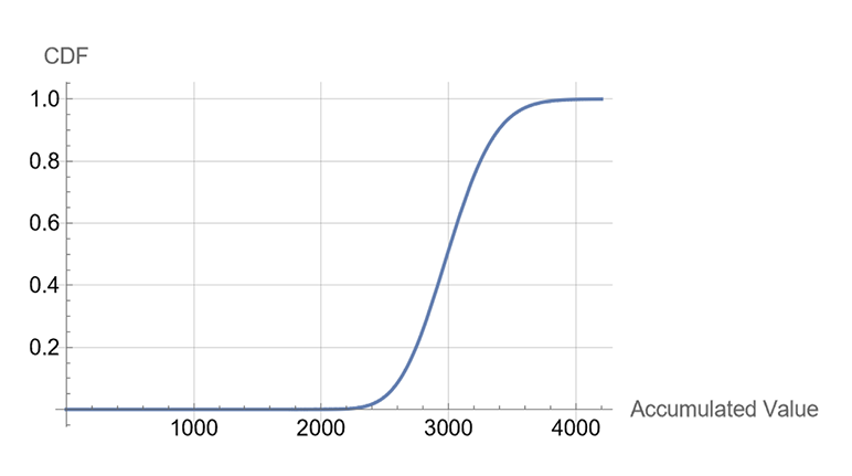 For the purposes of the demonstration, we will imagine that the distribution function that best fits this policy is a Gamma distribution with shape parameter 100 and scale parameter 30.