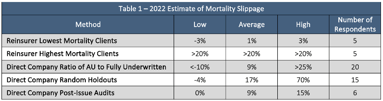 One of the biggest areas of interest for actuaries and others is what kind of mortality slippage, i.e., mortality in excess of fully underwritten experience, to expect. We tried to address this in the report in five ways: