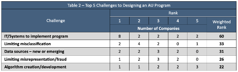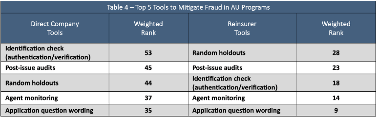 The next question was on the top 5 tools to mitigate fraudulent practices in AU programs. This question was also asked of both the direct companies and reinsurers, and the results are shown in Table 4 below.