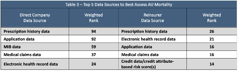 The top two answers for the direct companies, prescription history data and application data, were indicated as being much more important than the other three, MIB data, medical claims data, and EHR data. For the reinsurers, the top 5 answers did not have as much variance because there were less reinsurers than direct companies responding. The top two answers for the reinsurers were prescription histories and electronic health record data. There was one unique answer in both lists, MIB data for the direct companies and credit data/credit attribute-based risk scores for the reinsurers.