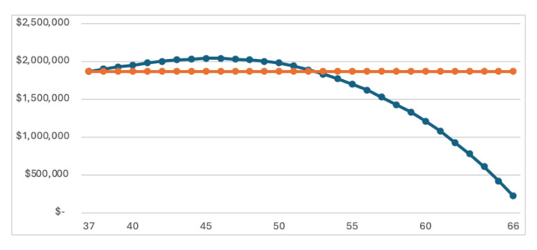 A traditional calculator recommending 10X gross income would cover less than half the value of this individual initially. A traditional calculator using this human value method would recommend $1,870,000 level face amount 30-year term as illustrated in orange. This traditional approach will leave the insured under-protected until age 53 and then increasingly over-insured precisely when the annual cost of mortality is ramping up and the underwriting benefits to the carrier are wearing off (see Figure 1).