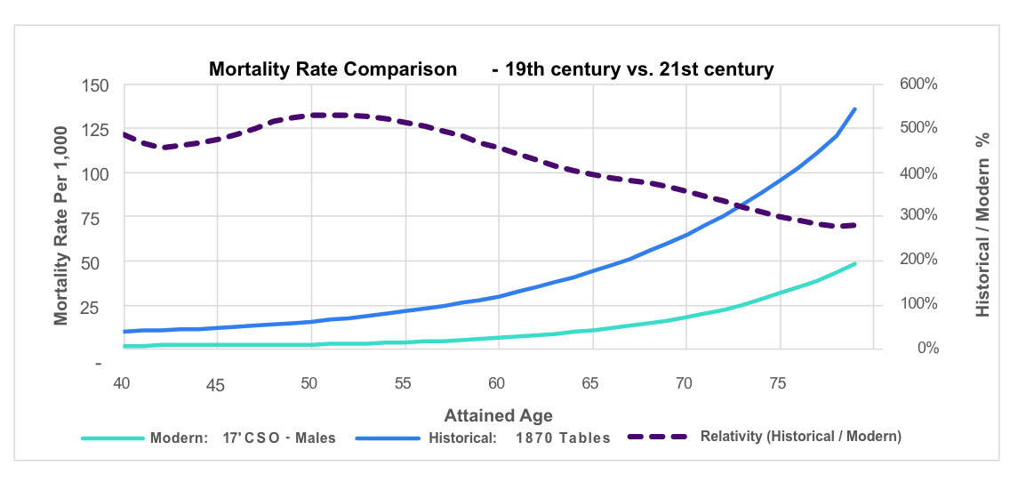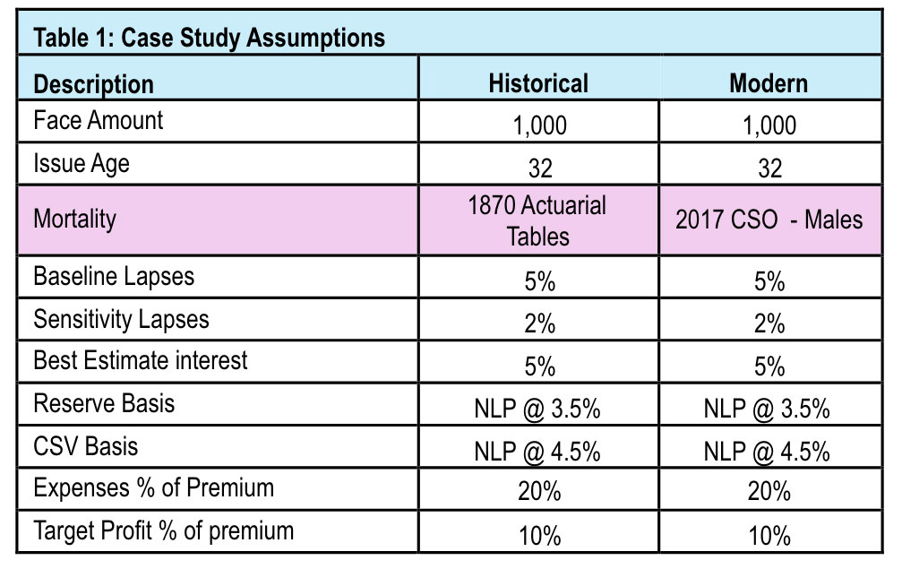 Figure 1 summarizes the mortality tables used. Unsurprisingly, mortality improved significantly since the 19th century. This relates to the case study because fewer deaths mean premium dollars (relative) must be distributed elsewhere. A greater proportion of premium dollars must now be distributed to surrender benefits.