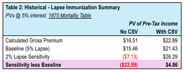 In this article, I argue that the imposition of cash surrender value reduces a company’s sensitivity to lapse rates. I also contend that lapses are more difficult to predict than mortality. As an empirical example, there exists far fewer industry lapse tables than industry mortality tables. I further contend lapse risk can be material. As an example, long-term care insurance (LTCI) suffered from an overestimation of lapse rates and has no CSV. LTCI is extremely[[6]] lapse supported. Carriers originally estimated around 5% ultimate lapse rates but, these rates materialized to be around 1% or lower[[7]] which increased benefits paid.