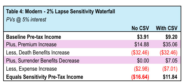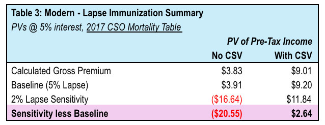 - Lower mortality rates in the modern scenario made the no CSV product relatively more sensitive to lapses given deaths occur later.