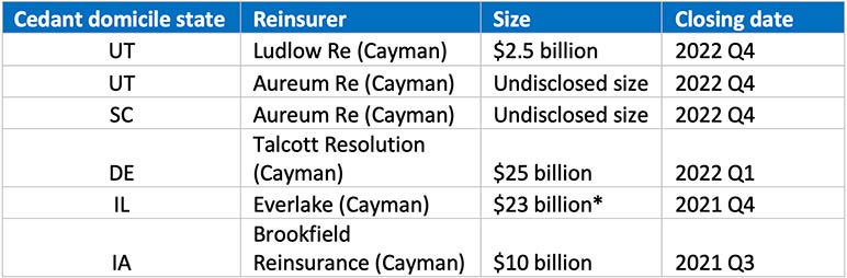 Cayman has seen rapid growth in life and annuity reinsurance business. Figure 1 covers 12 Cayman life reinsurers. From 2020 to 2021, their total assets under management (AUM) increased three times, and from 2021 to 2022 it increased another 97%. By the end of 2022, their total AUM has reached US$59 billion,[4] which corresponds to approximately 8% of the assets that U.S. life and annuity insurance companies transferred to asset-intensive reinsurers.[5] Table 1 lists some of the life and annuity reinsurance transactions that have been successfully closed and reinsured to Cayman reinsurers in the past two years. One of these Cayman reinsurers has confirmed to date they have not had any issues or concerns from the U.S. states’ regulators in terms of approving the transactions and giving full reserve credits to the cedants.