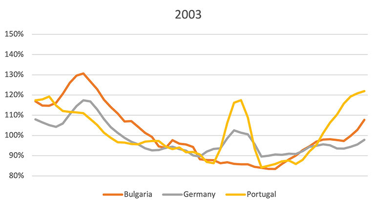 Four-week Moving Average Deaths per Week in 2003, 2013 and 2018 for Bulgaria, Germany and Portugal Compared to the Country-specific Average of All Weeks in 2000-2019