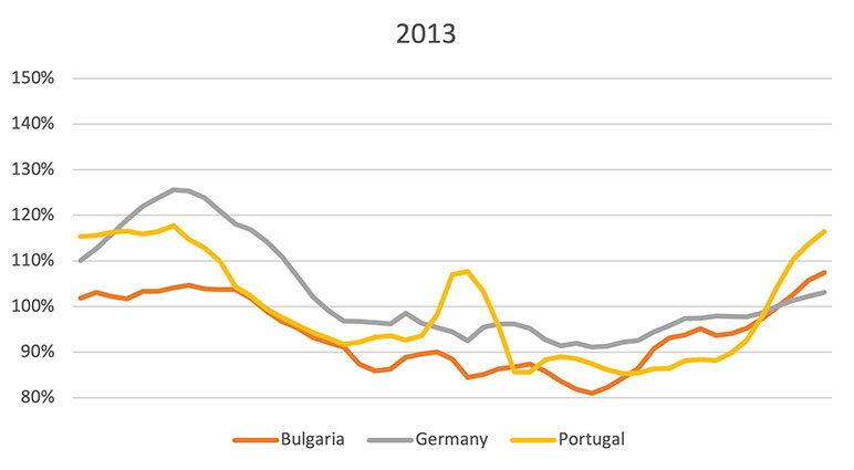 The significant mortality impacts of the aforementioned 2003 heatwave are not the only example of heat-related mortality that affected Europe in the recent past. Different health care systems, climate zones, population structures and other country-specific features can result in different mortality observations. Figure 1 shows the four-week moving average of deaths per week for the years 2003, 2013 and 2018 compared to the average of all weeks in a country from 2000–2019 in Germany (central Europe), Bulgaria (southeast Europe) and Portugal (southwest Europe). During the selected years, summer mortality appears to be elevated in Germany and Portugal and—to a lesser extend—in Bulgaria.