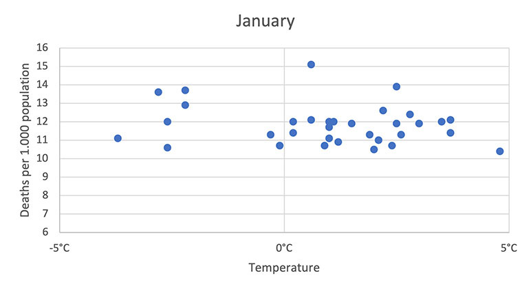 A logical next step after investigating rising temperatures and the resulting heat mortality is to look at the flipside: cold mortality. Can the increased mortality during heatwaves be offset by reduced cold mortality? To answer that question, we must distinguish between cold mortality and mortality during the cold season.