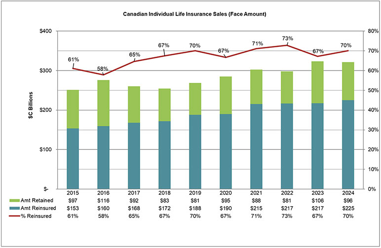The portfolio retrocession market in Canada is also limited. Pacific Life Re reported C$14.3 billion in volume written in 2024, up over 200% over the C$4.5 billion volume they reported in 2023.