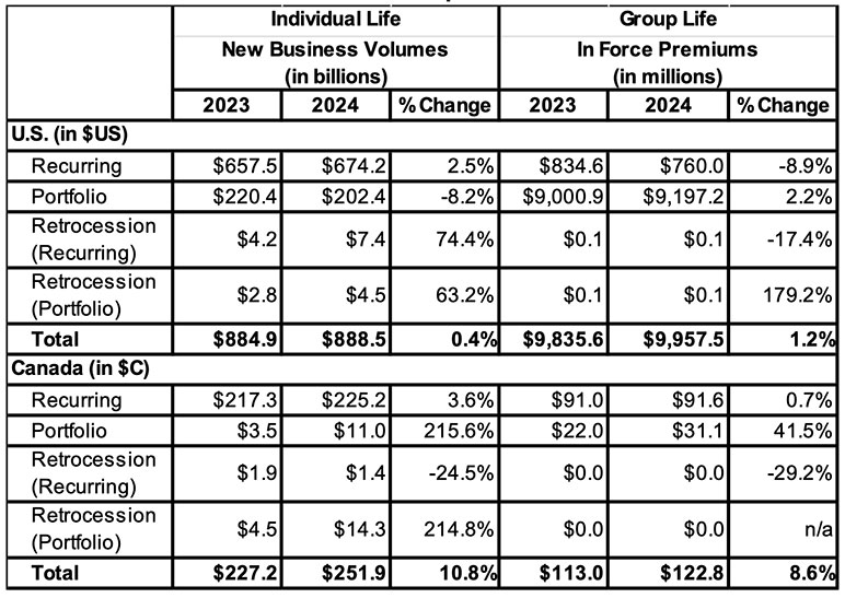 Portfolio group premium in force totaled U.S.$9.2 billion in 2024, up 2% from the U.S.$9.0 billion reported in 2023. Canada Life Reinsurance reported U.S.$8.7 billion in portfolio premium in 2024, up slightly from the U.S.$8.5 billion reported in 2023. Munich Re reported U.S.$0.45 billion in 2024, down slightly from its reported 2023 value of U.S.$0.46 billion.