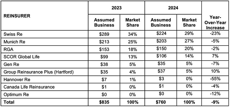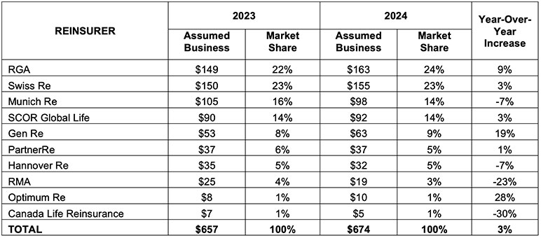 The top three individual life reinsurers in the Canadian market during 2024 (based on market share) were RGA, Munich Re, and PartnerRe. Together, these three reinsurers hold a 76% market share. RGA topped recurring new business writers by reporting C$64 billion of written volume in 2024 (up 10% over 2023). Munich Re followed with C$61 billion (16% increase from 2023), followed by PartnerRe with C$46 billion (6% increase from 2023). Of the seven reinsurers reporting in the 2024 survey, six reported increases in recurring new business volumes from 2023 to 2024. Table 3 summarizes assumed volumes and market share by reinsurer for 2023 and 2024.