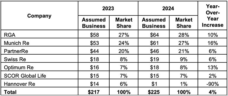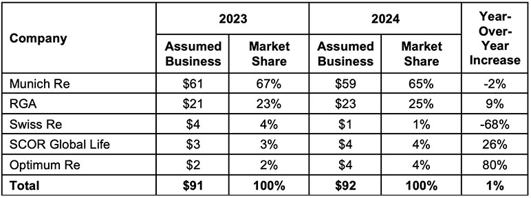 The top five U.S. individual life reinsurers by market share represent 85% of 2024 reinsurance production, up 2 percentage points over the 83% market share this group held in 2023 — see Table 2 for the information by reinsurer.