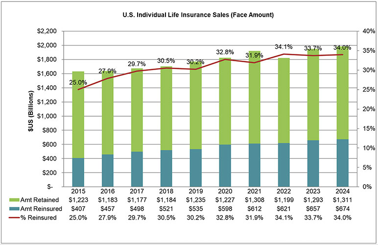 Recurring individual life new business volume in 2024 grew for the ninth consecutive year, from U.S.$657.1 billion in 2023 to U.S.$674.2 billion in 2024 (a 2.5% increase). One contributing factor to the increased volume of U.S. individual life reinsurance is the continued growth in accelerated underwriting programs and the expansion of face amounts available under these programs. These factors elicit support from reinsurers in product and program development, as well as in risk sharing.