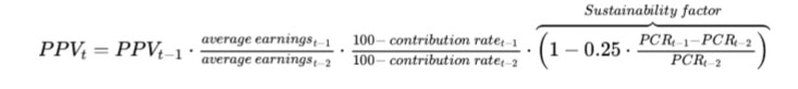 The “sustainability factor” in the formula adjusts the pension point value for changes in the ratio of pensioners to contributors. If the ratio increased by 1, the pension point value would decrease by one-quarter of one percent. We noted above that the ratio of pensioners to workers was expected to rise from 38% in 2022 to 59.1% in 2052. With no other changes, that would mean that the sustainability factor adjustment would reduce pensions (21.1/4) or 5.275% over those 30 years.