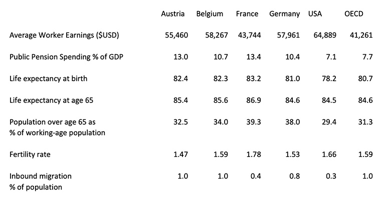 The statistics in this table are all OECD data. Average worker earnings, public pension spending, life expectancy at birth and population over 65 as a percentage of working age population come from the country profiles of Pensions at a Glance 2023. The fertility rates come from Pensions at a Glance 2023, and the migration data from OECD's International Migration Outlook 2023.