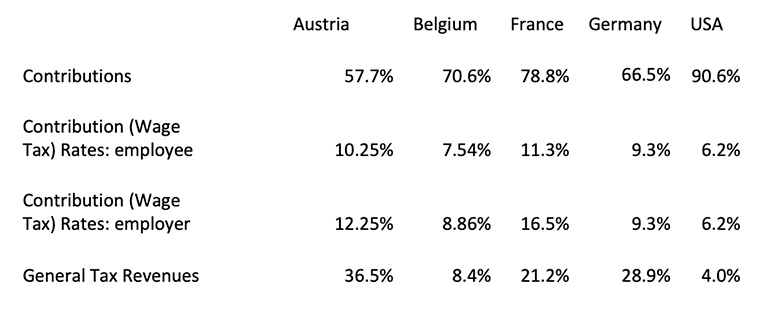 The contribution rate data comes from OECD 2023, p. 209. The other data for Austria and Germany come from the reports for each country “Financing Social Protection” of the European Social Policy Network of the European Union, 2019. The daa for France comes from “Pension Projections for the 2021 Ageing Report of the Ministry of Economy and Finance, March, 2023.