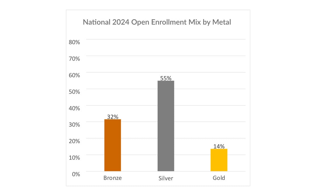 Some interesting differences are emerging between states, as they approach silver loading differently. For example, New Mexico has mandated a 44% silver CSR load, which assumes only the richest silver plan variants will be purchased and results in premiums that more closely match true plan costs. This generally results in the PTC subsidies being funded to the greatest degree by the federal government and makes gold plans cheaper than silver plans, which is not the pattern seen in other states that don’t mandate silver CSR load levels. In 2024, silver plans were typically 20% more expensive than gold plans (with some outliers), and only one in five carriers offered a bronze plan, as seen in Figure 1.
